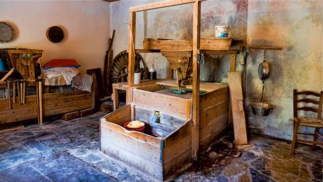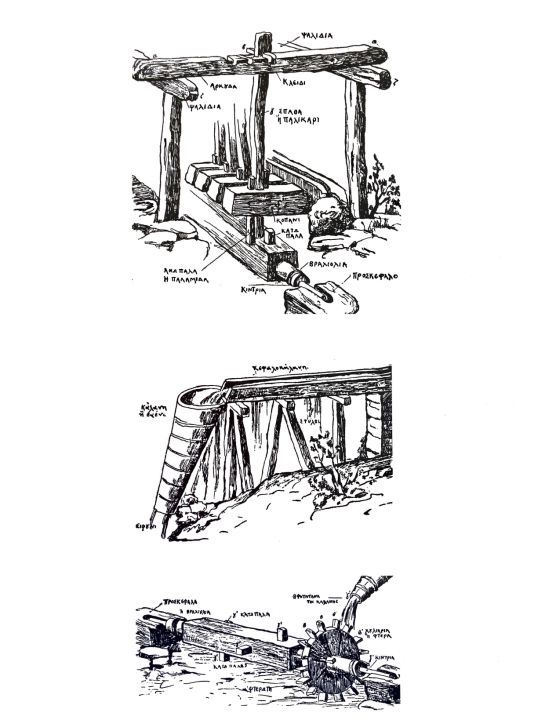 γ) καρούτα: σκάφη πάνω στη μυλόπετρα όπου τοποθετούσαν το γέννημα για να το αλέσουν στο νερόμυλο