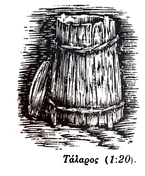 Ο τάλαρος ήταν απαραίτητο σκεύος για το αλάτισμα του τυριού και των ελιών και κατασκευαζόταν από τους «καδάδες». Υπήρχε και μέγας τάλαρος , η ταλάρα, που χρησιμοποιούνταν για τον τρύγο των σταφυλιών.
