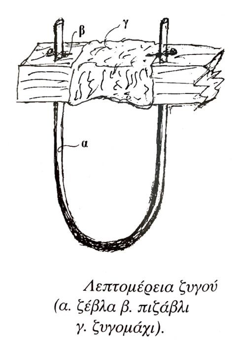 δ) Ζυγομάχι. Πρόβειο δέρμα, καρφωμένο στο ζυγό, ανάμεσα στη ζέβλα, το οποίο «ελάφρυνε» το ζυγό στο σβέρκο των ζώων.